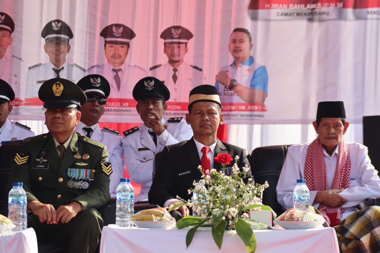 Tak hanya itu, para kepala desa dari seluruh wilayah Kecamatan Mekar Baru juga turut hadir, didampingi perangkat desa masing-masing. Perwakilan dari organisasi kepemudaan, kelompok masyarakat, serta tokoh pendidikan, mulai dari kepala sekolah hingga guru, ikut serta dalam prosesi. Siswa-siswi yang menjadi peserta upacara terlihat berbaris dengan penuh disiplin. Kehadiran warga masyarakat pun semakin menambah kekhidmatan suasana.
